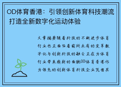 随着科技的不断进步,体育行业也正面临着前所未有的变革,数字化与创新科技的融合正在为体育行业带来崭新的面貌。OD体育香港作为领先的创新体育科技企业,凭借其先进的技术研发和深远的行业眼光,致力于打造全新的数字化运动体验。本文将围绕OD体育香港如何通过技术创新引领体育科技潮流展开详细探讨,重点分析其在智能化体育设备、虚拟现实与增强现实技术、数据分析与运动员表现优化以及用户体验提升四个方面的创新应用。通过深入研究OD体育香港的具体举措和成果,本文旨在展示这一企业如何推动体育行业的未来发展,并为全球体育科技带来深远影响。文章最后将结合上述讨论,总结OD体育香港在体育科技领域的贡献与前景,展望其未来在数字化运动体验中的重要角色。