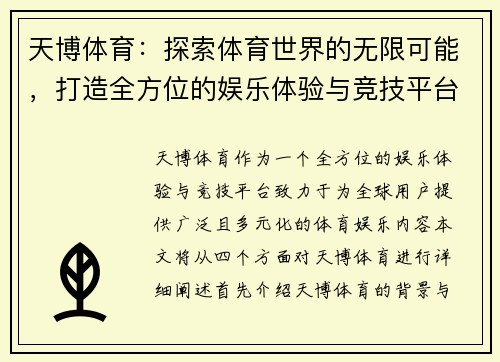 天博体育的成立可以追溯到近几年,作为一家致力于推动体育文化发展的综合性平台,它迅速吸引了全球范围内大量体育迷与娱乐玩家的关注。其创新性的经营模式及平台设计,使得它在短时间内便在体育娱乐市场中占据了一席之地。天博体育将传统体育赛事与现代数字娱乐完美结合,提供丰富的赛事直播、游戏互动和多样化的娱乐内容,满足不同用户的需求。